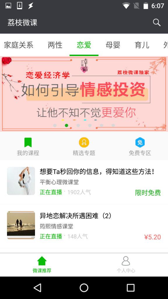 国内在线教育的平台非常多,诸如网易云课堂,传课网,YY教育,多贝,51CTO等等,特别推荐荔枝微课这个微课教育平台,原因之一是它的界面比较小清新,而且和微信做了深度的绑定整合,团队成员在前期也测试过荔枝微课的使用效果。