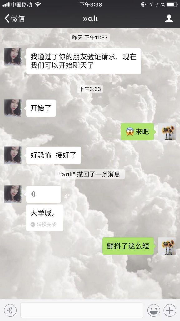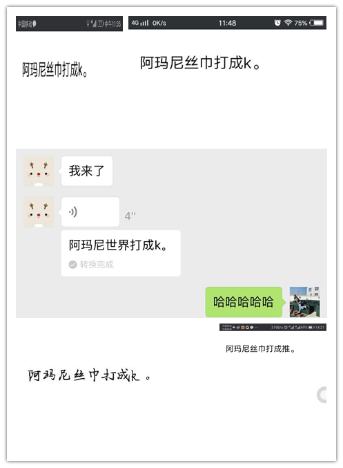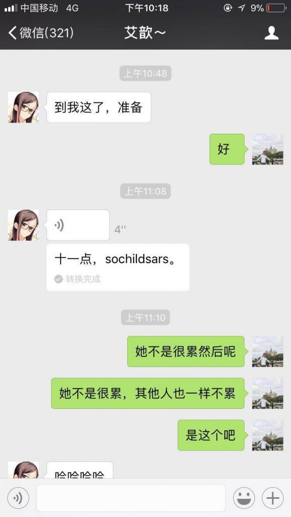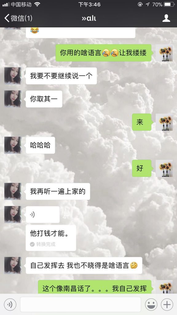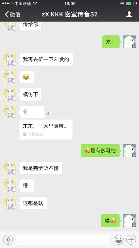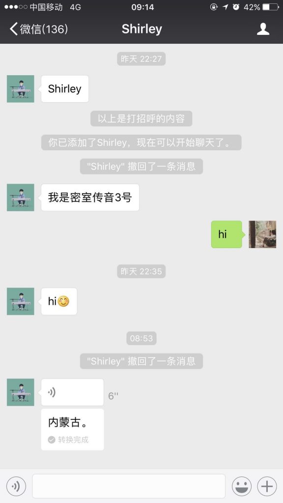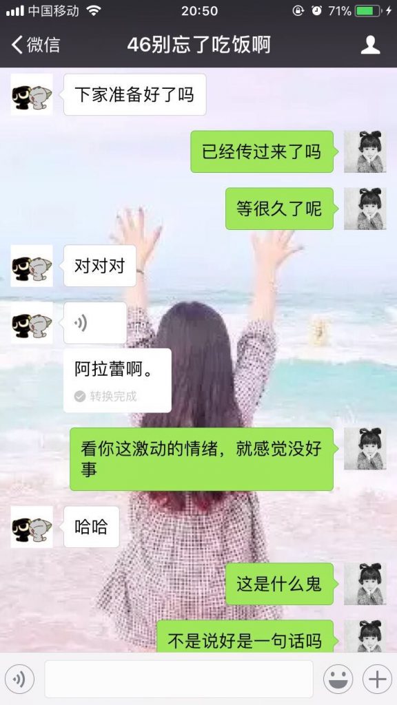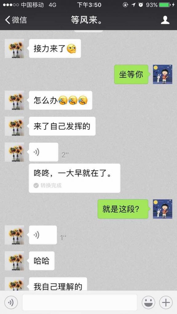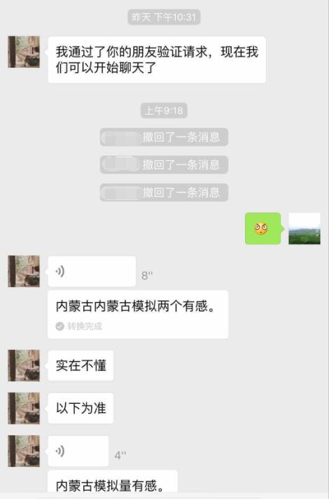 语音传递到第三位小精灵【Shirley】时,因为3号小精灵完全听不懂粤语,微信语音转文字的功能第一次发挥了它神奇的功用,内蒙古和没人宠的女人闪亮登场了!让我们默默感受一下4号收到语音时的那一刻的心情!