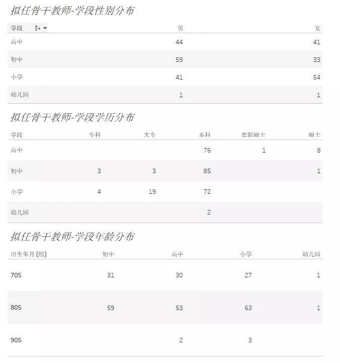 在小学组里,我们惊人的发现,语文老师是此次拟任骨干教师的绝对主力,占据了一半的人数。(很多人说的那句话“你小学的数学是语文老师教的吗?”,可能有点道理!)