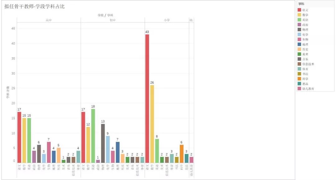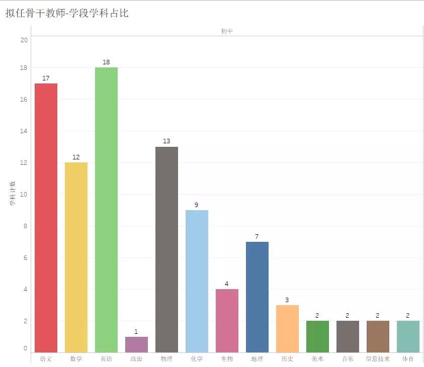 在初中组里,语文、数学、英语老师的数量仍然是占大头,物理老师的数量也不逞多让。最让人意外的,是只有一位政治老师在拟任骨干教师的名单之中。