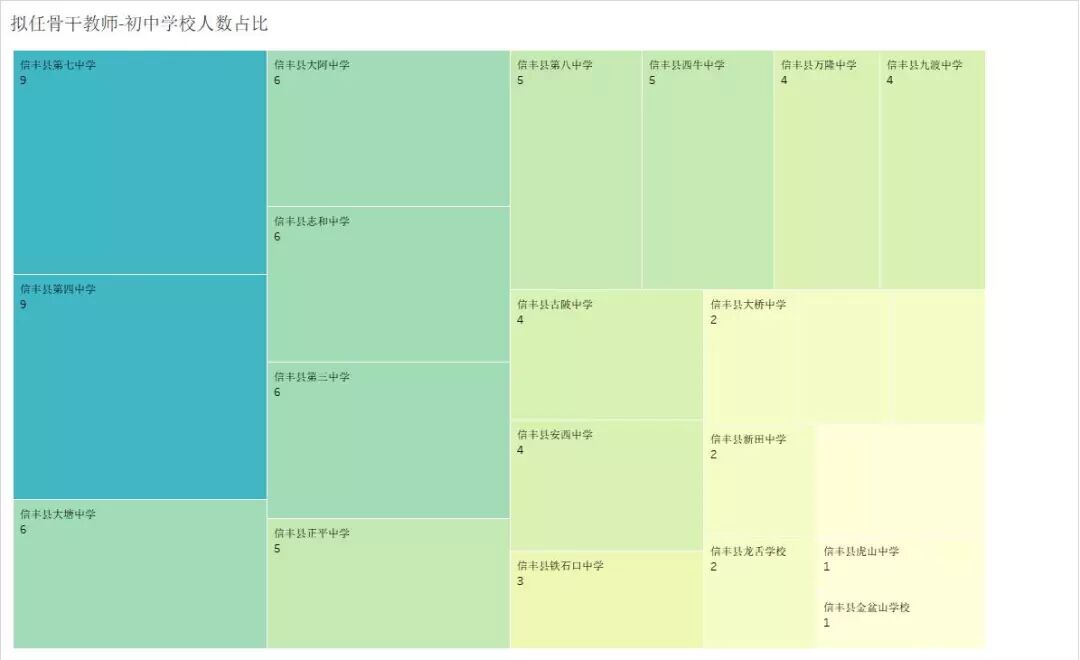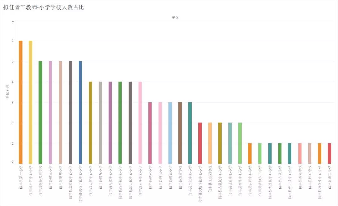 在中学学校里,信丰七中、信丰四中位列第一,都有9名老师入选,信丰三中、大塘中学、大阿中学、志和中学各有6位老师入选。从分布列表上,可以看的出来,各个乡镇中学的师资力量也是在不断地加强。