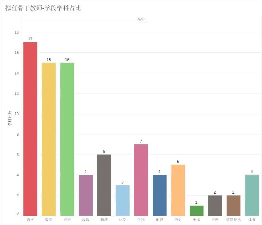 在有高考压力的高中学校中,语数外三门基础学科的骨干教师数量,还是妥妥的稳居前三甲的,音乐、美术、计算机不出意外的位列最末。比较意外的是,生物老师的数量居然超过了物理老师,排到了第四位。